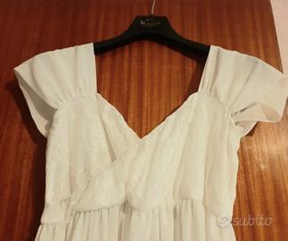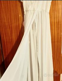 Elegante vestito lungo, perfetto per shooting fotografici di maternità, taglia M Realizzato in tessuto leggero e fluttuante. Design con scollo a cuore. Maniche corte a sbuffo. Cintura in vita per definire la silhouette.