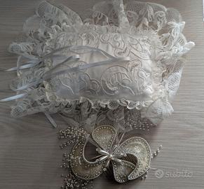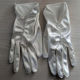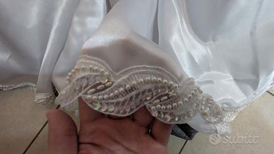 Vestito Matrimoniale Demetrios Vintage in buone condizioni completo di coda removibile, guanti, fermaglio per capelli e porta fedi. Il vestito è un tubino con pizzo, strass e perline.