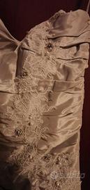 Vendo abito da sposa in perfette condizioni. Linea Raffaelli, taglia 44/46 prezzo un po' trattabile. È sempre stato coperto con l' apposito copri abito e velo compreso. Il colore è particolare: un tortora chiaro/perlato che alla luce del sole tende al dorato. Il tessuto, di alta qualità ,è in taffetà quindi elegante che crea lucentezza con spacco a sinistra con pizzo e raso sotto. La parte del corpetto leggermente a cuore è ricca di decorazioni con perline e pizzo tutte sul lato fino ad arrivare all' inizio dello spacco. Ha una coda abbastanza lunga e sulla schiena ci sono dei lacci in raso bianco per poter "chiudere" il corpetto. Morbido e vestibilità ottima. È abito romantico.