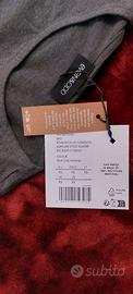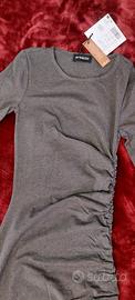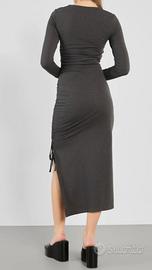 Vestito midi a maniche lunghe di maglina grigio scuro screziato. Lunghezza al polpaccio con arriccio e spacco laterale.