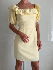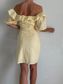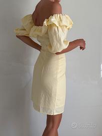Vestito Mini Giallo Pastello con Volant nuovo di HM Perfetto per l'Estate nuovo Tessuto misto lino Misura xs ma veste come una S Lunghezza 72 cm, vita 37 cm, da ascella ad ascella 43 cm mini abito in una delicata tonalità giallo limone/pastello, ideale per le giornate estive Il vestito presenta un romantico scollo Bardot (spalle scoperte) impreziosito da un ampio volant che prosegue sulle maniche a palloncino leggermente avvitato per valorizzare la silhouette #vestitogiallo #minidress #offtheshoulder #estate2026 #ruffledress #vinteditalia
