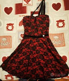 Vestito in pizzo nero con fodera rossa.. monospalla con 2 fettucce di velluto nero.. chiusura nel retro con cerniera in metallo/oro.. compresa imbottitura x il seno.. tg M/44.. essendo elastico si adatta alla tg 46.. ideale x feste natalizie, capodanno, ballo, compleanni.. se ritiri a mano risparmi le spese di spedizione..