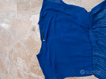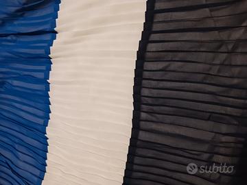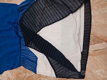 Vestito con gonna plissettata interamente foderato taglia S_M avendo elastico in vita e chiusura tramite 2 piccoli bottoni sul retro. Lunghezza complessiva 85 cm. Lunghezza gonna 45 cm. Scollo a barca. Colore blu nero e bianco