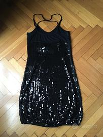 Vestito Motivi nero con spalline interamente ricamato con paillettes quadrate. Fascia di maglia e fiocco in vita. Taglia L veste una 42, lunghezza cm 80 senza spalline vita cm 39 95%viscosa. Ritiro a Milano zona Abruzzi Plinio