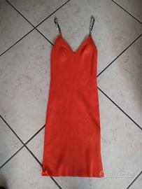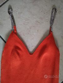 Vestito da donna colore arancio taglia S un maglina a coste, con bretelle di brillantini