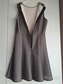 Il modello presenta una linea svasata che valorizza la figura con eleganza. Il tessuto ha un raffinato motivo geometrico e la chiusura con zip sul retro lo rende comodo da indossare.