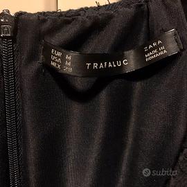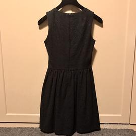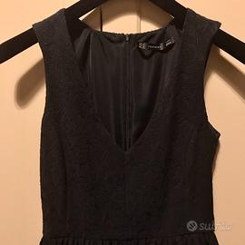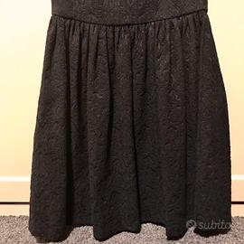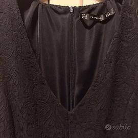 Vestito corto damascato nero di Zara con scollatura a V e gonna a campana. Il cartellino indica una taglia M, ma veste bene una S.