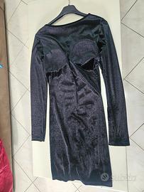 vestito corto nero a maniche lunghe, con una scollatura rotonda.Presenta un dettaglio di allacciatura incrociata sul davanti, dal corpetto fino alla parte centrale del vestito.Il tessuto ha un aspetto lucido e presenta delle arricciature che creano volume, specialmente nella parte centrale e inferiore del vestito.