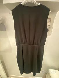 Elegante vestito nero con scollo a V incrociato e drappeggio sul fianco.