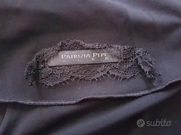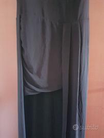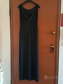 Vestito nero da sera Patrizia Pepe con gonna e proseguimento lungo. Indicato come taglia I 165 cm; il vestito è largo 38-40 cm circa (ascelle) e lungo 145 cm circa. Vestibilità del busto (il vestito è elasticizzato) circa 42. Disponibili ulteriori foto se richieste; l'etichetta interna non è facilmente fotografabile. Tessuto principale: 75% acetato, 20% Nylon, 5% Elastan. Fodera principale 83% Nylon, 17%Elastan