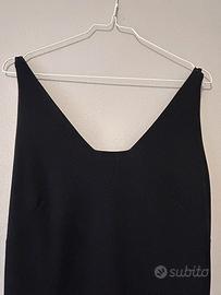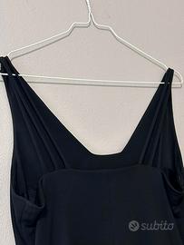 Vestito nero elegante con spalline sul retro formate da tre fili. Stoffa molto leggera. Intero vestito foderato all'interno in nero. Nemo srl. Taglia 44 100% Poliestere. Lunghezza circa 88,5 cm. Made in Italy.