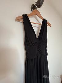 vestito lungo nero, elastico, due strati, quello superficiale di tessuto velato, scollo dietro sulla schiena e davanti scollo non troppo profondo, nel vestito integrati due lacci per fare il fiocco sul retro, gonna ampia. taglia unica, vestibilità molto buona.