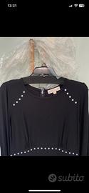 Vestito nero a manica lunga, lungo fino alle ginocchia con volant sul fondo! Borchie argento all’altezza del giro vita e davanti alle spalle. Vestibilità elegante, molto comoda e morbida, non troppo aderente.