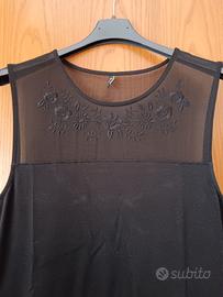 Abito nero in cotone, adatto per tutte le stagioni. Lunghezza sopra il ginocchio, la parte alta del vestito è trasparente arricchita da ricami mentre la gonna è composta da due strati quello interno in cotone, come il vestito, quello esterno in tulle.