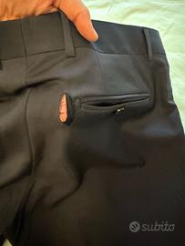 -Pantalone con tasche frontali all'americana, tasche posteriori tagliate con bottoni, chiusura con bottone