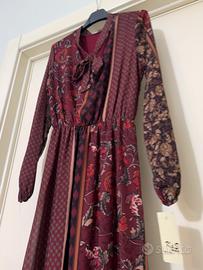 Vestito lungo, scollo con fiocco da annodare, elastico in vita e a fondo manica, foderato. Taglia unica, nuovo con cartellino.