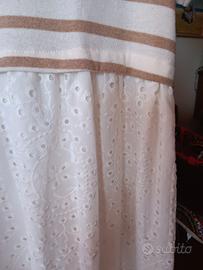 Delizioso vestito nuovo intero. Corpino in jersey a strisce bianche color vaniglia, gonna lunga in puro cotone sangallo.