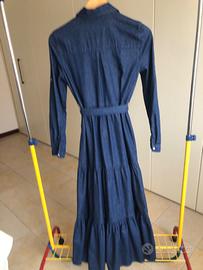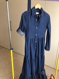 Vestito lungo in jeans,svasato con cintura in vita,manica lunga che può essere arrotolata e diventare corta