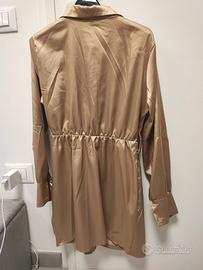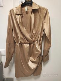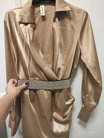 elegante vestito in tessuto satinato colore oro,scollo a v e cintura impreziosita von strass in ottimo stato. taglia unica