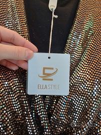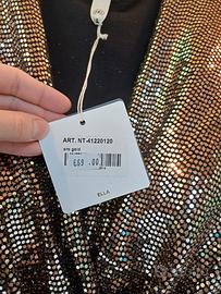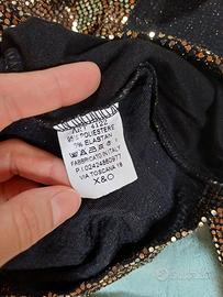Vestito da sera con paillettes oro e interno nero a manica lunga e con scollo a V.