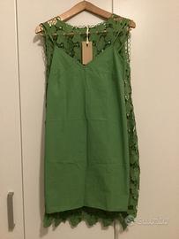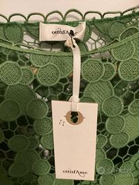 NUOVO mai indossato. Bellissimo vestito verde in COTONE di pizzo che sembra lavorato all’uncinetto con la sua sottoveste abbinata. Taglia 42. Marca Ottod’ame. Acquistato per errore presso boutique Suede Milano. Pagato 166 euro a maggio. Non avessi perso lo scontrino l’avrei reso. È perfetto. La misura tra le estremità delle spalline è 40,0 cm. La vita faccio un po’ fatica perché il taglio scende minimamente scampanato. Una misura media è 53,0 cm. Poi 47,5 cm è la distanza da ascella ad ascella e circa 85,0 cm dalla base del collo davanti all’orlo inferiore.
