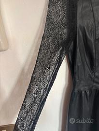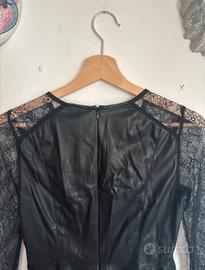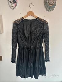 Vestito con punto vita segnato e chiusura con cerniera posteriore. Finta pelle e maniche in pizzo. Modello gonna a balze. Taglia XS