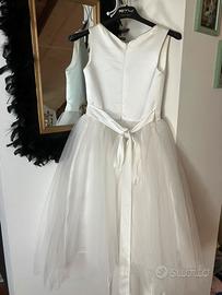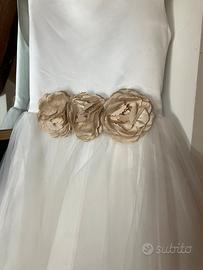 Delizioso abito da cerimonia per bambina, perfetto per occasioni speciali come matrimoni, battesimi o feste eleganti. Il vestito presenta un corpetto semplice e raffinato in raso bianco, senza maniche, abbinato a una gonna ampia in tulle per un effetto principesco. In vita, tre fiori decorativi in raso color champagne aggiungono un tocco romantico e delicato. Chiusura con zip sul retro per una vestibilità comoda. Taglia 9/10 anni. Usato una volta
