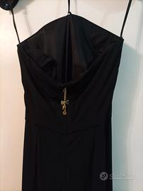 Abito lungo Elisabetta Franchi nero, elegante e femminile, con raffinato scollo a balconcino che valorizza il décolleté. Il modello segna delicatamente il punto vita e scende morbido, slanciando la silhouette. Perfetto per eventi, cerimonie o serate speciali.