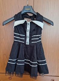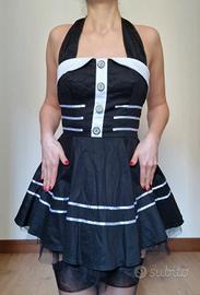 È un vestito stile pin-up retrò, nero con dettagli bianchi a contrasto che lo rendono elegante e al tempo stesso grintoso: