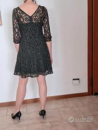 Colore verde bosco, pizzo in 50% cotone+35% viscosa, fodera in poliestere, taglia S ma veste una M, lunghezza al ginocchio (la modella è alta 171 cm). Indossato solo 1 volta durante una cerimonia.