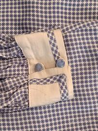 Leggerissimo abito stampato in quadratini bianchi e pervinca, taglio in vita e rifinitura in bianco per un effetto scollo a V. Gonna foderata e polsini impreziositi da piccoli bottoni in tinta. Lunghezza gonna al polpaccio. Marca Fiorella Rubino