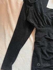 in taglia S nuovo mai indossato nero glitterato con collo drappeggiato trasparente e dietro scollatura schiena