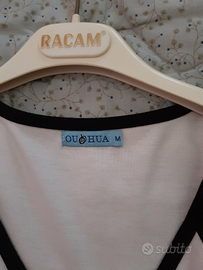 Vestito in bianco e fasce laterali nere, con bretelle e scollo a v, in misto cotone, tag M . Ideale per andare al mare o per stare in casa .