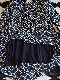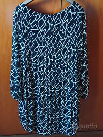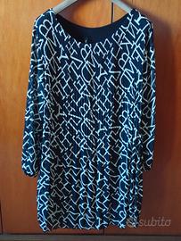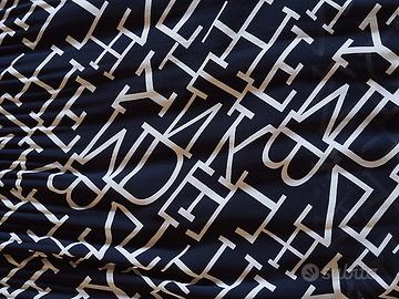 Vestito leggero fondo nero con fantasia in beige (lettere dell'alfabeto). Doppio strato in tessuto nero per evitare trasparenze. Misure ultima foto, veste fino a taglia 48.