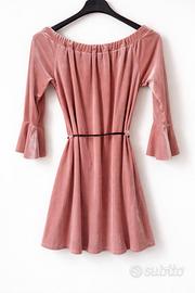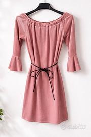 Vestito rosa cipria effetto velluto Delizioso vestitino corto color rosa cipria, perfetto per un look femminile e romantico 💕 Modello con scollo a barchetta (spalle scoperte) e maniche a campana, super elegante ma anche comodo. La vita è regolabile grazie al cinturino sottile nero, che valorizza la silhouette. Il tessuto è morbido e piacevole al tatto, ideale sia per il giorno che per la sera. 📏 Vestibilità: fluida, adatta a diverse forme 👗 Lunghezza: sopra il ginocchio 🌸 Condizioni: ottime / come nuovo Perfetto con collant e tacchi per un look chic, oppure con stivaletti per un outfit più casual.