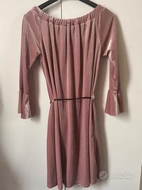 Vestito rosa cipria effetto velluto Delizioso vestitino corto color rosa cipria, perfetto per un look femminile e romantico 💕 Modello con scollo a barchetta (spalle scoperte) e maniche a campana, super elegante ma anche comodo. La vita è regolabile grazie al cinturino sottile nero, che valorizza la silhouette. Il tessuto è morbido e piacevole al tatto, ideale sia per il giorno che per la sera. 📏 Vestibilità: fluida, adatta a diverse forme 👗 Lunghezza: sopra il ginocchio 🌸 Condizioni: ottime / come nuovo Perfetto con collant e tacchi per un look chic, oppure con stivaletti per un outfit più casual.