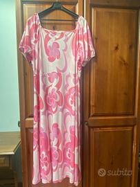 Vestito lungo alla caviglia in fantasia toni di rosa e panna. Apertura davanti chiusa con fiocco e maniche a sbuffo.