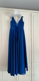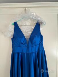 Vestito sartoriale da cerimonia in raso Fatto in un atelier di Busto Arsizio Taglia 44 colore bluette Con confezione e già mandato in lavanderia Il dietro è regolabile ci sono i laccetti Nessun difetto