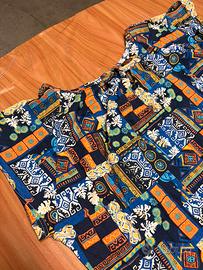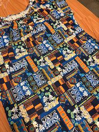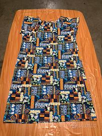 Abito sartoriale senza marca, realizzato artigianalmente, con vivace fantasia geometrica multicolor su base blu. Modello corto con maniche corte e scollo morbido arricciato, che dona una vestibilità comoda e fresca. Perfetto per l’estate, il mare o look casual vintage. Tessuto leggero e traspirante, ideale per chi cerca un capo unico e originale, non industriale.