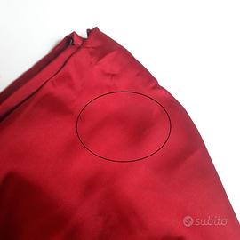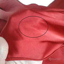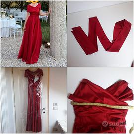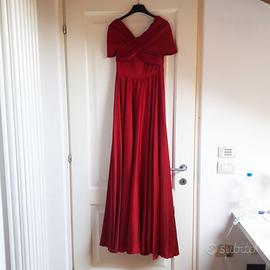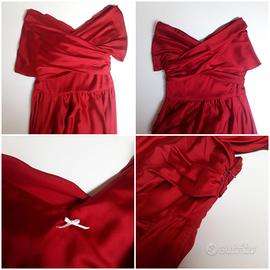Abito lungo da sera o da cerimonia, sartoriale realizzato in Atelier. Colore rosso intenso. Parte alta con fasce incrociate sul decollete (sia davanti che dietro) che coprono parzialmente spalle e braccia. Leggero scollo a V. Tessuto in raso spesso. Chiusura con cerniera su un fianco. Con nastro da annodare in vita o al collo, a piacimento.