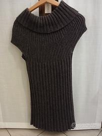Vestito donna in lana senza maniche, colore viola scuro, con collo a scialle e spilla a rosa (lana lavorata a rosa) come decorazione (può essere tolta); lavorazione a coste; nuovo ma senza cartellino.