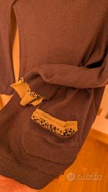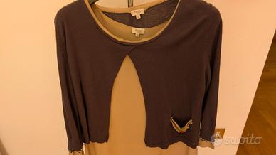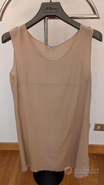 Abito smanicato color crema in seta pura con un corto giacchino colore tortora in lana leggera a maniche lunghe, impreziosito da perline