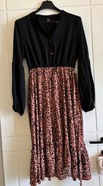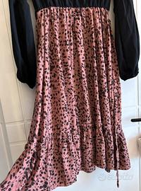 Abito donna marca Shein, nuovo senza cartellino, mai indossato, taglia L, manica lunga, gonna maculata rosa antico e nero, lunghezza al polpaccio, con cintura regolabile, materiale in poliestere.