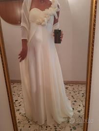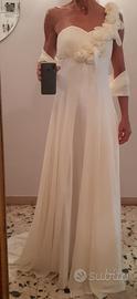 Vestito perfetto taglia 40-42, chiffon di seta e raso che avvolgono e accompagnano la figura con pannelli che si aprono sul davanti e una ghirlanda di roselline che orna il monospalla. E, in più, anello coprispalla di seta. Comodissimo e leggero. Condizioni ottime, praticamente nuovo. Per una sposa meravigliosa e per un giorno indimenticabile!