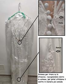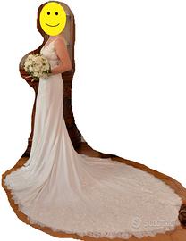 Vendo abito da sposa bianco, con corpetto lavato dai ricami e ricami presenti anche sullo strascico. Il vestito è fatto con un tessuto di altissima qualità. Il vestito è dotato di un gancetto per poter tirare su lo strascico così da poterlo raggruppare dietro la schiena e poterci camminare senza grandi problemi in modo da renderlo molto più comodo durante la giornata di utilizzo. Oltre a questo sistema è presente anche il classico laccetto per tenere lo strascico al polso. La taglia del vestito è circa una S. Se interessati si possono mandare ulteriori foto dell'abito in tutti i suoi dettagli.