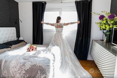 Abito da sposa stile romantico "da principessa", lungo ed elegante a due pezzi. Realizzato in tulle combinato con pizzo ricamato con perline che si catturano la luce con un leggero scintillio. Con scollatura a cuore e corsetto sul retro, abbinato a una giacca in tulle staccabile. Look esclusivo di Luna Studio.Della collezione 2025 (Luna Studio Atelier), indossato solo 6 mesi l'anno scorso per il mio matrimonio (ho ricevuto tantissimi complimenti) in ottime condizioni praticamente come nuovo dopo la lavanderia. Le spalline e il bolerino (giacca seconda pelle con pizzo ricamato) sono staccabili, per sfoggiare due stili: coperto ed elegante per la cerimonia, scollato e sensuale per il ricevimento!La taglia è una 44 spagnola, stretta in vita con bustino rinforzato per il seno (porto una quarta abbondante) ma può essere modificato tutto tranquillamente con l'aiuto di una sarta per vestiti da sposa. Ha una coda bellissima e, nonostante sia grande, ho fatto togliere diversi stati di tulle sotto per renderlo più leggero e comodo da portare, non perdendo l'effetto principesco. sono alta 1.65 e avevo 10 cm di tacco. il prezzo originario è di 3600 comprato in Atelier ( fattura a comprova)
