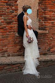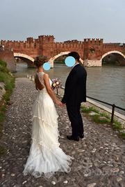 Vendo abito da sposa stile boho chic, colore bianco panna, taglia 40-42, altezza sposa 1,60 circa con tacco 7,5 cm. E’ stato acquistato presso Loris Spose di Bussolengo (VR) e utilizzato il giorno del matrimonio. Lavato in lavanderia, custodito nel suo porta abito originale, in perfette condizioni come da foto. Per info contattatemi dopo le ore 17.30.