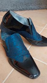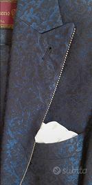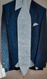 Vestito da sposo damascato blu completo di fascia, camicia e scarpe.