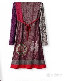 Vestito patchwork stile Desigual multicolore con fantasia geometrica e applicazioni decorative cucite.