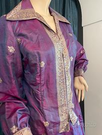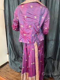 Vestito composto da gonna lunga e giacca sopra viola con motivi dorati marca “Andreina “ Roma